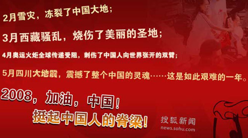 谁也不曾料到,这是如此艰难的一年。2008,我们热切期待的阳光和欢笑,却不料被一路风暴阻隔。2月肆虐的雪灾,冻裂了中国大地;3月的拉萨暴力事件,烧伤了美丽的圣地;4月的奥运火炬传递受阻,刺伤了中国人向世界张开的双臂;善变的5月,胶济铁路火车相撞,撞碎了多少旅人的梦;突然传遍全国的儿童手足口病,令全国父母心头纠结;震动传及东南亚的四川大地震,撼及整个中国的灵魂……然而,中国在低头抱怨吗? 没有,中国挺起了他的脊梁!全民一心,共同抗灾! |