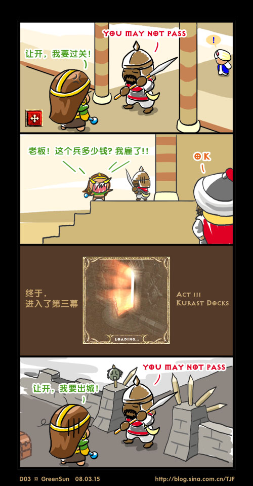 放上一幅暗黑的小漫画,作者的博客还有不少有趣的游戏原创漫画,值得看看。“找杰海淫国王谈话过关的时候,十回有八回他不让进 - -|||;无敌一挡——老子唯一的本事就是堵你。”[转自: 星⊕月⊙夜的Blog]